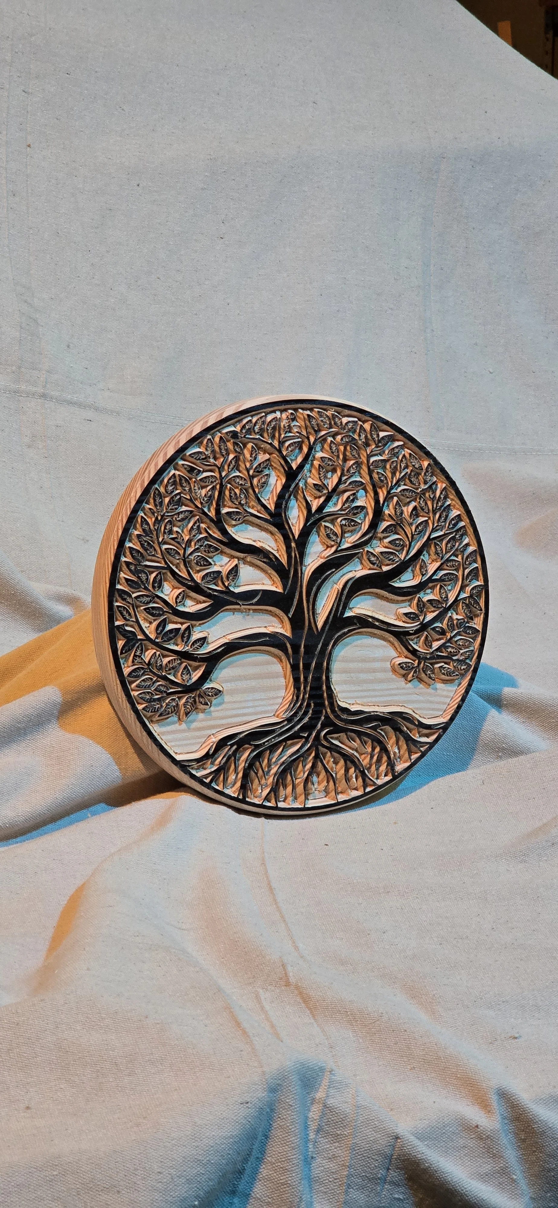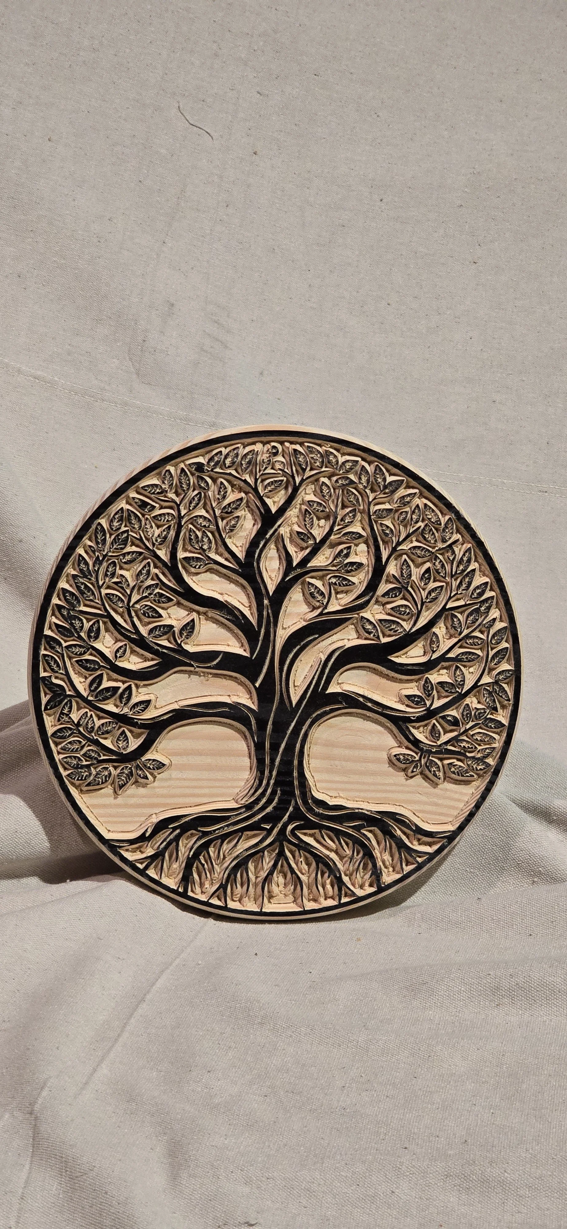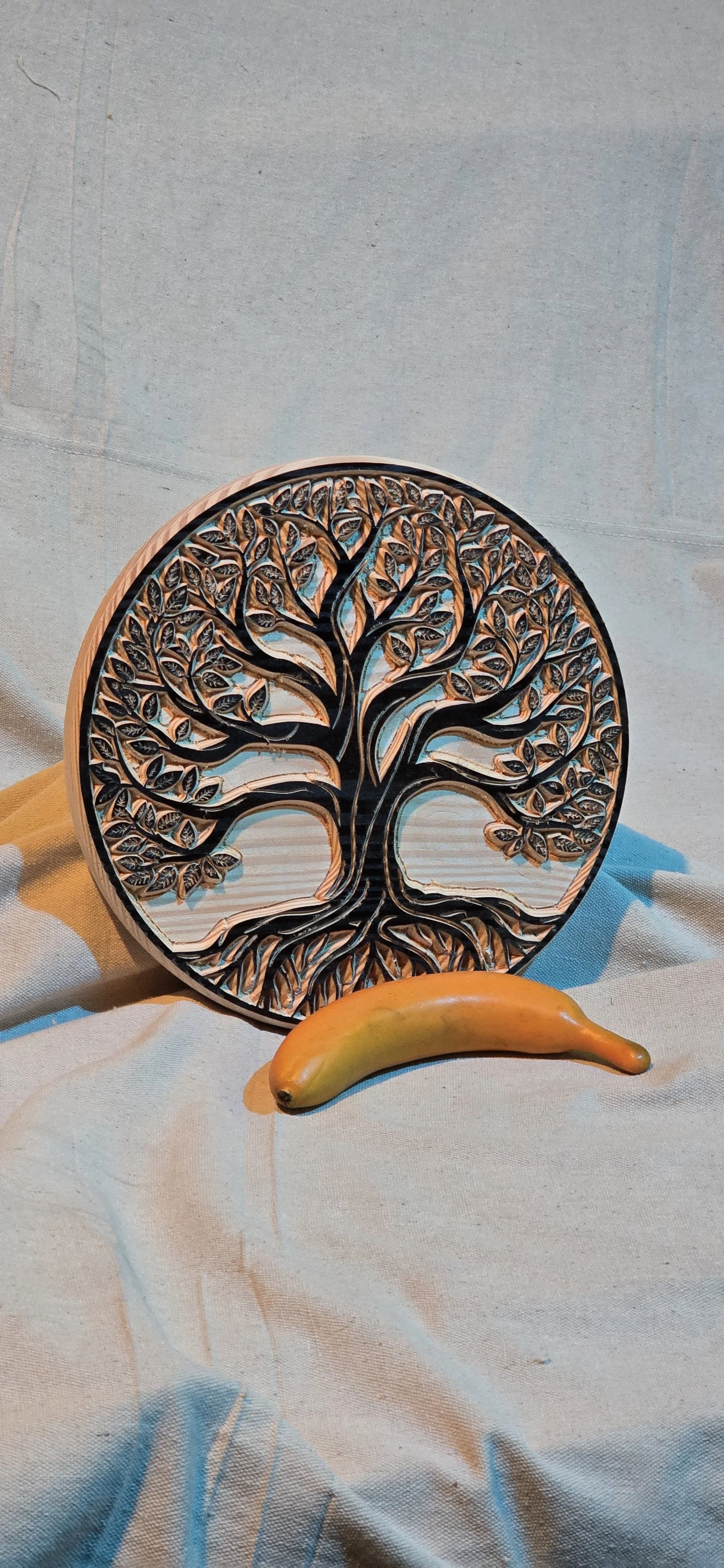 A unique Tree of Life design engraved on 1.25” thick pine with black detail. Keyhole slot in back for wall hanging.